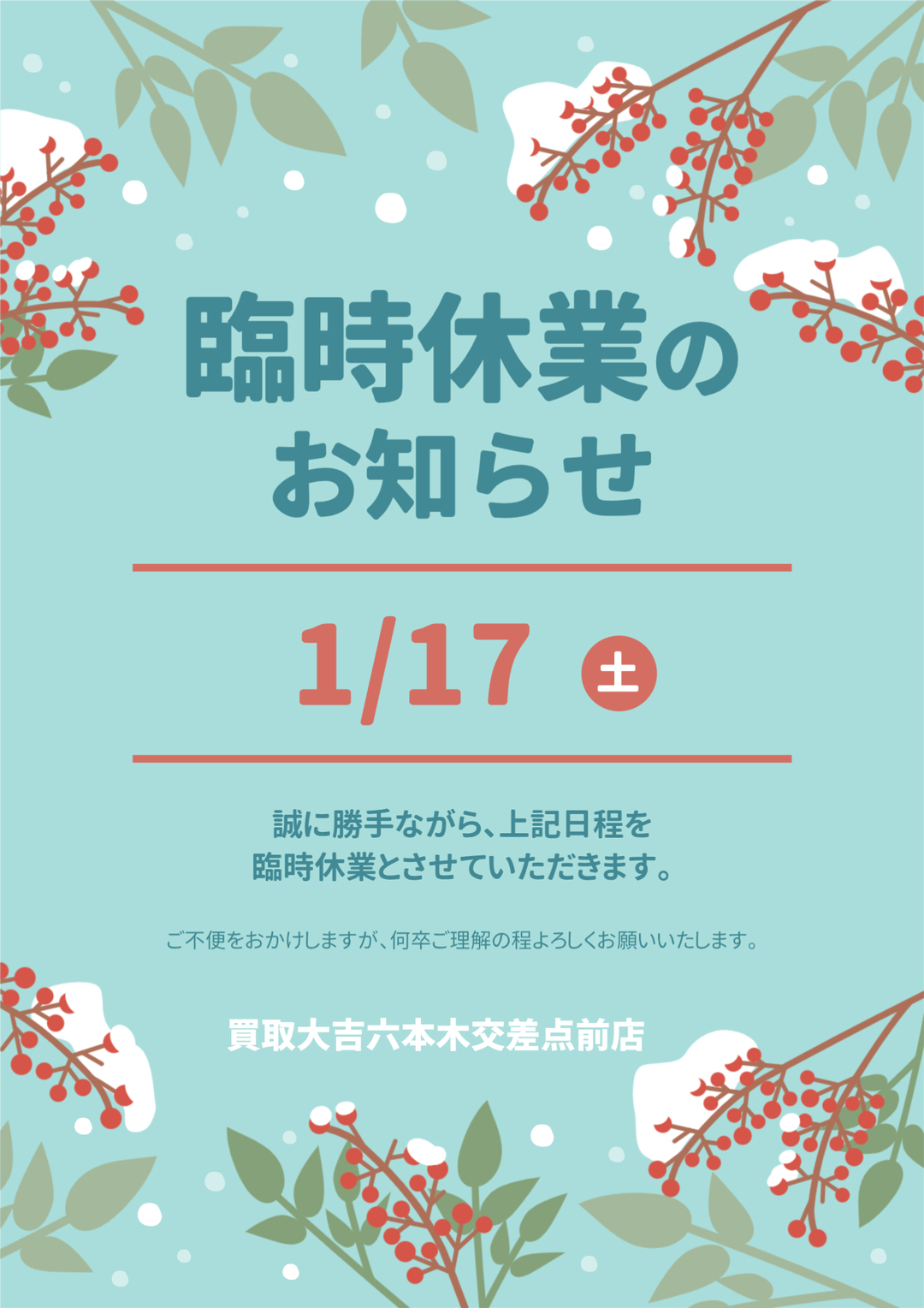 誠に勝手ながら1月17日(土)は全日休業とさせて頂きます。